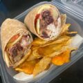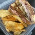 Honey roasted turkey, Chef John’s Thanksgiving stuffing, cranberry mayo, cheddar cheese on Fantini cranberry bread. Pressed to perfection on the grill. Served w/ a side of our homemade Mann -made chips.